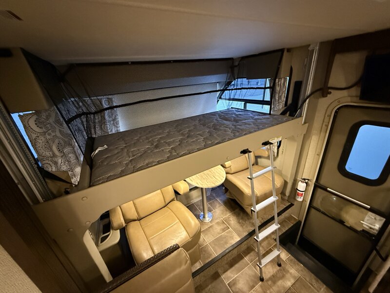 Inside, the smart floorplan includes a spacious living area, a well-equipped kitchen, and a private rear sleeping area. One of the standout features is the electric drop-down overhead bunk, providing additional sleeping space for family or guests without sacrificing living space during the day.