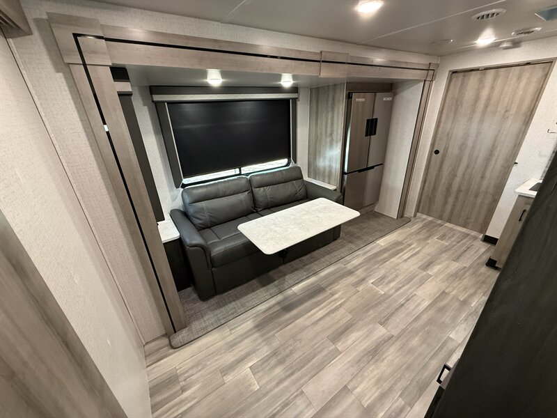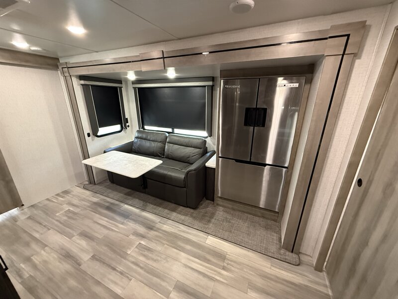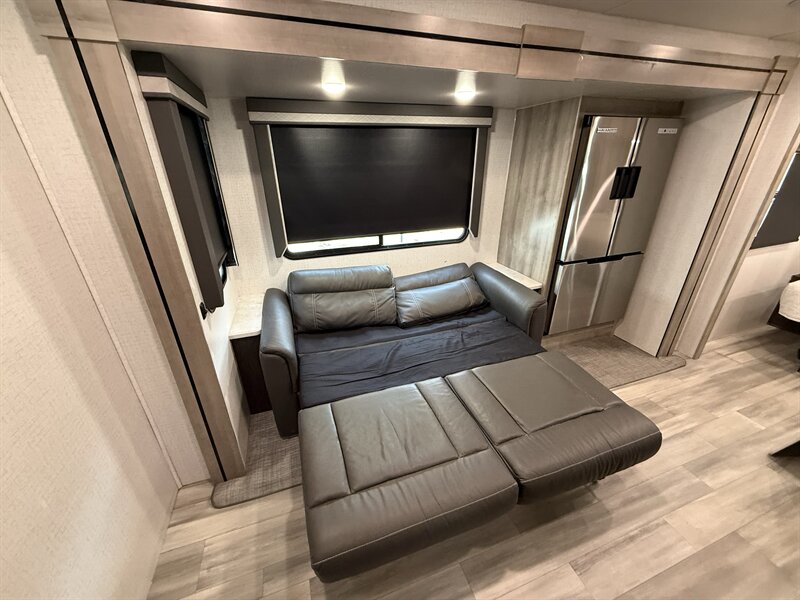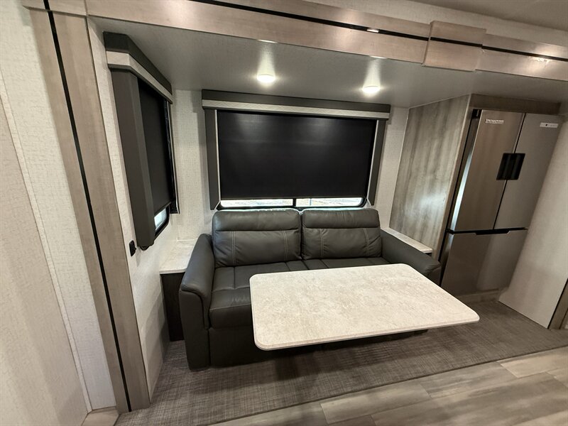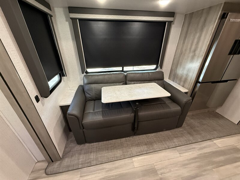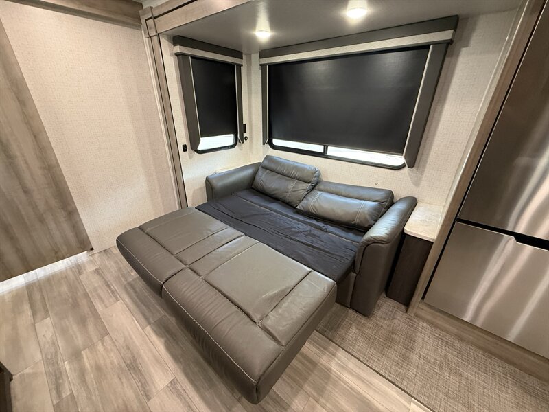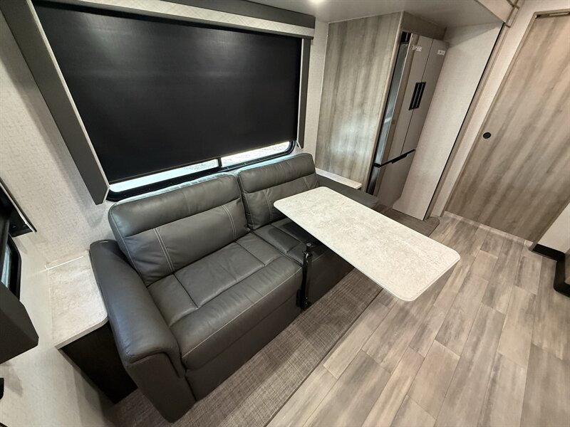 The Voyage 2427RB features a spacious living area, a large rear bathroom with generous storage, and a modern kitchen layout with solid-surface countertops and residential-style appliances. With factory rooftop solar, this trailer is also ready for off-grid camping and extended boondocking.