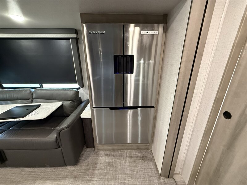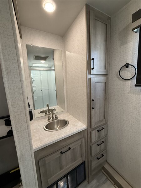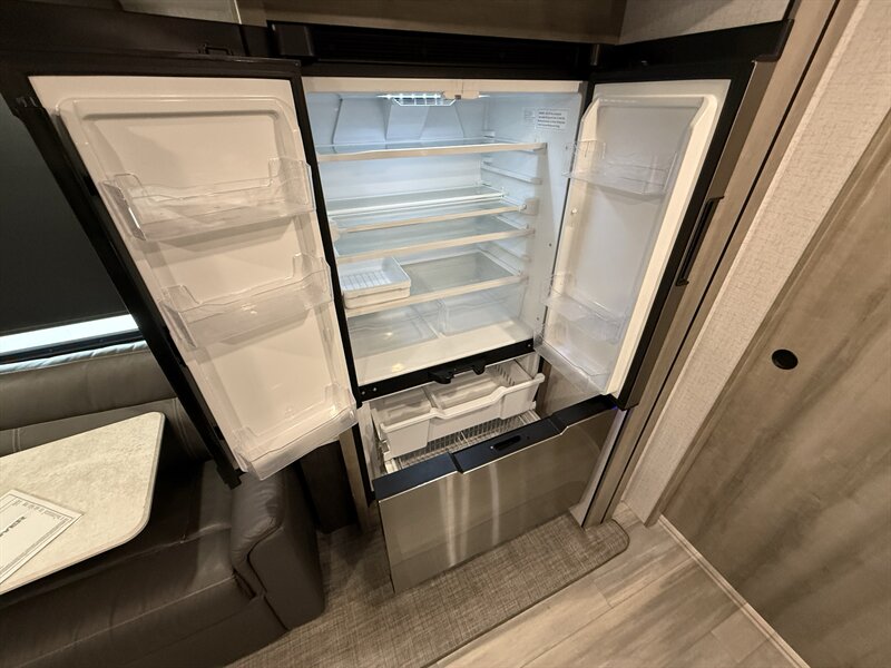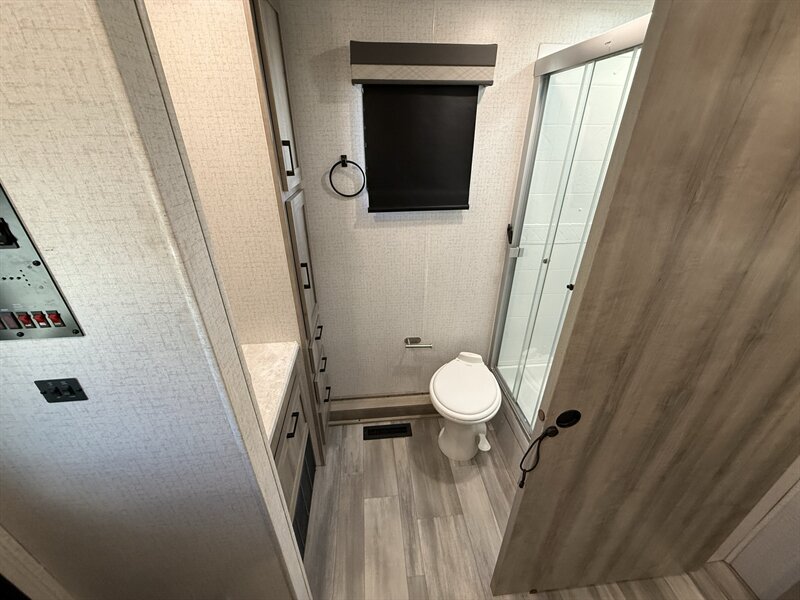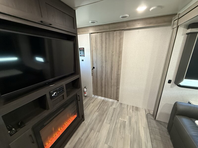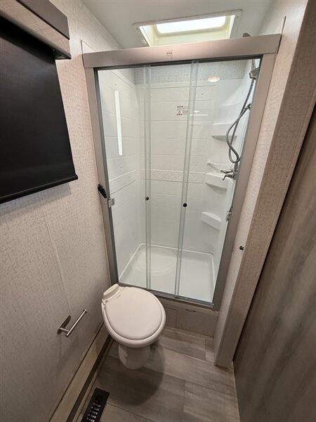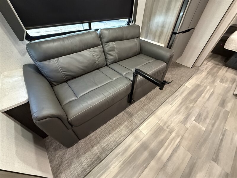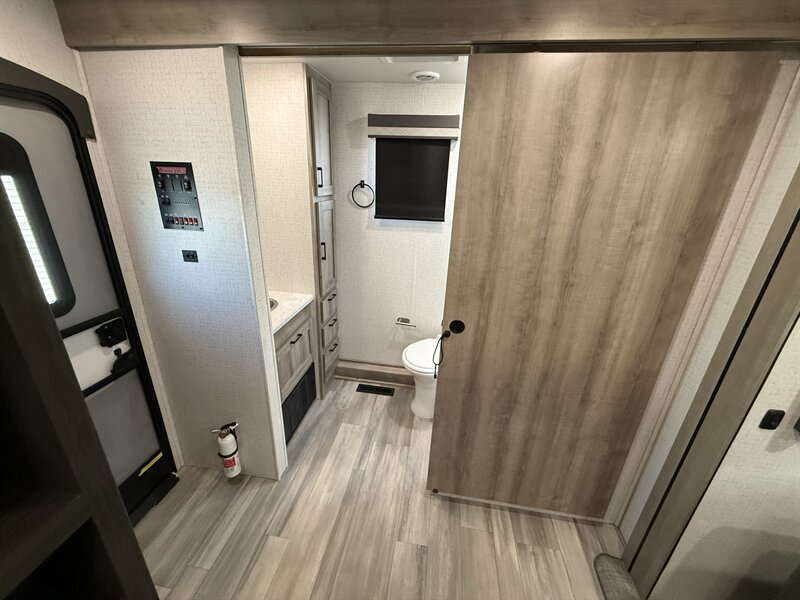The Voyage 2427RB features a spacious living area, a large rear bathroom with generous storage, and a modern kitchen layout with solid-surface countertops and residential-style appliances. With factory rooftop solar, this trailer is also ready for off-grid camping and extended boondocking.